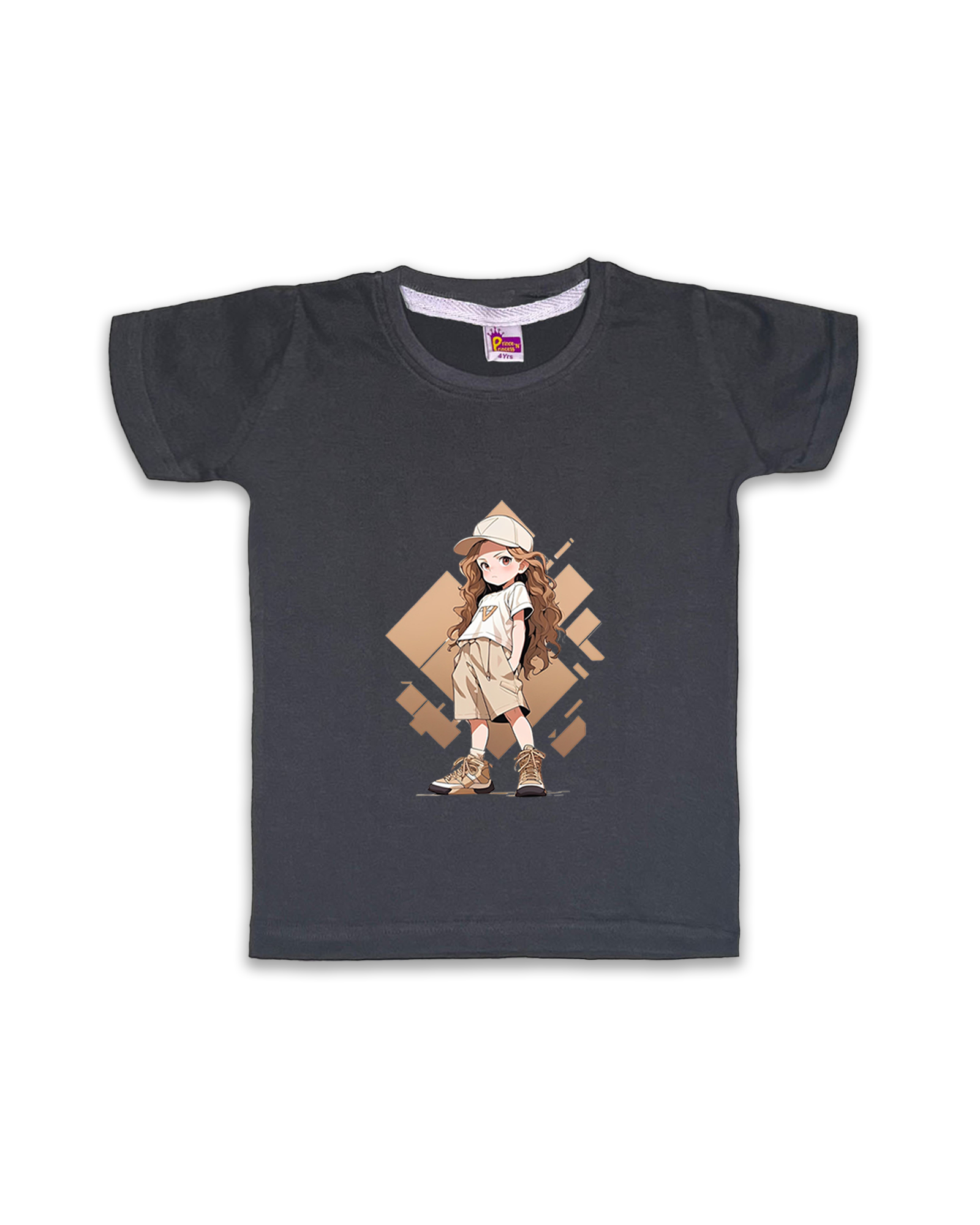 Kids’ Printed Half Sleeve Tees – Dark Grey Tees for Girls FTS070