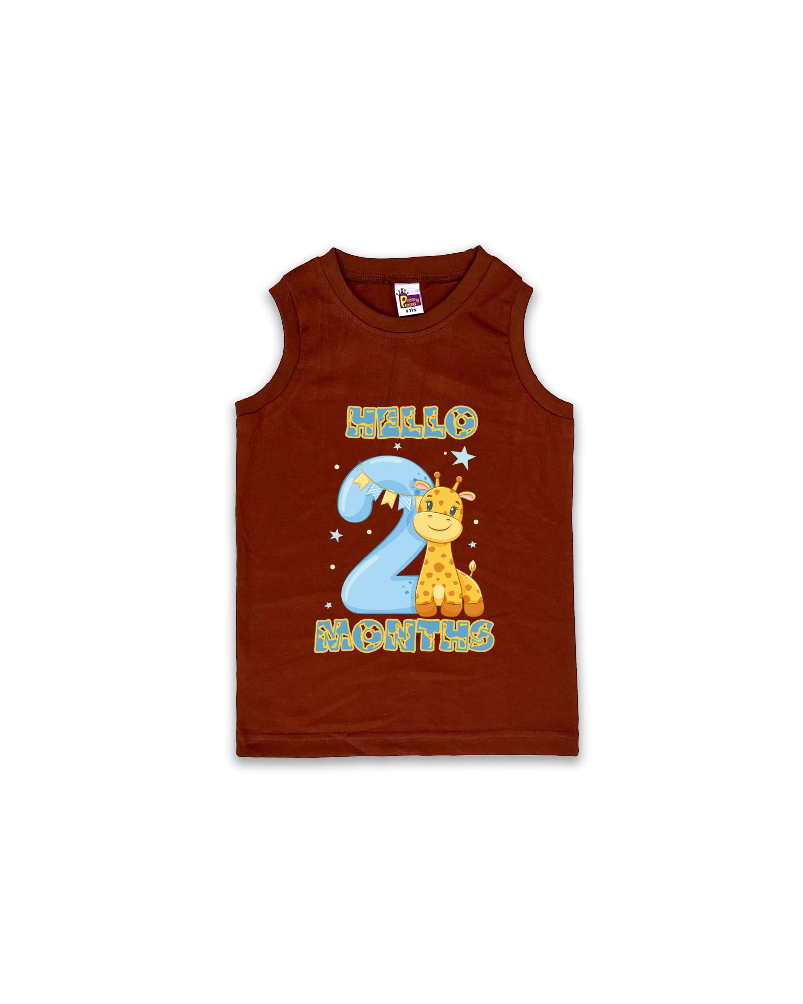 Newborn Chocolate Brown Sleeveless Vest "Hello 2 Months" – Soft Cotton | Giraffe Print Milestone Vest for Babies | NPT081