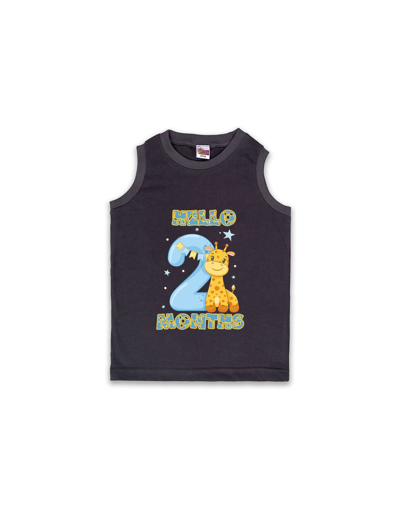 Newborn Dark Grey Sleeveless Vest "Hello 2 Months" – Soft Cotton | Giraffe Print Milestone Vest for Babies | NPT083