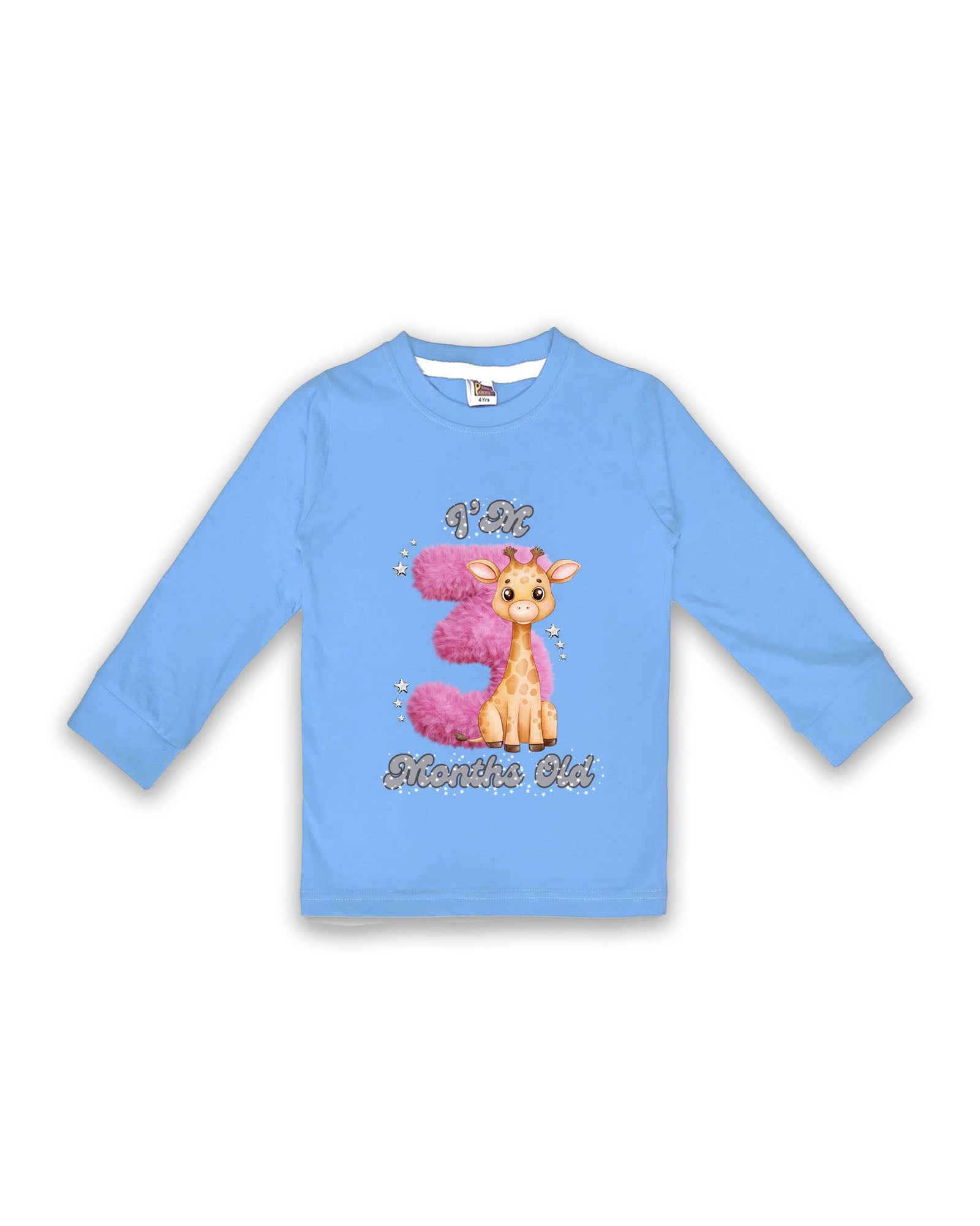 Newborn Ice Blue Full Sleeve "I’m 3 Months Old" Milestone Tees – Soft Cotton | Pink 3 with Giraffe Print | Milestone Outfit NPT026
