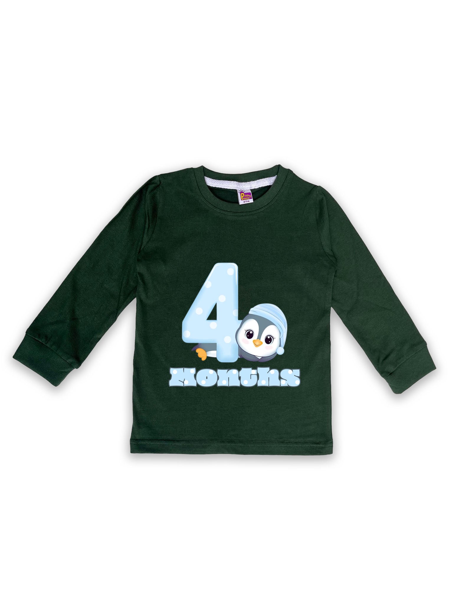 Newborn Full-Sleeve Dark Green Tees - 4 Months Milestone Tees with Adorable Penguin Design - Soft Cotton Baby Tees NPT0215