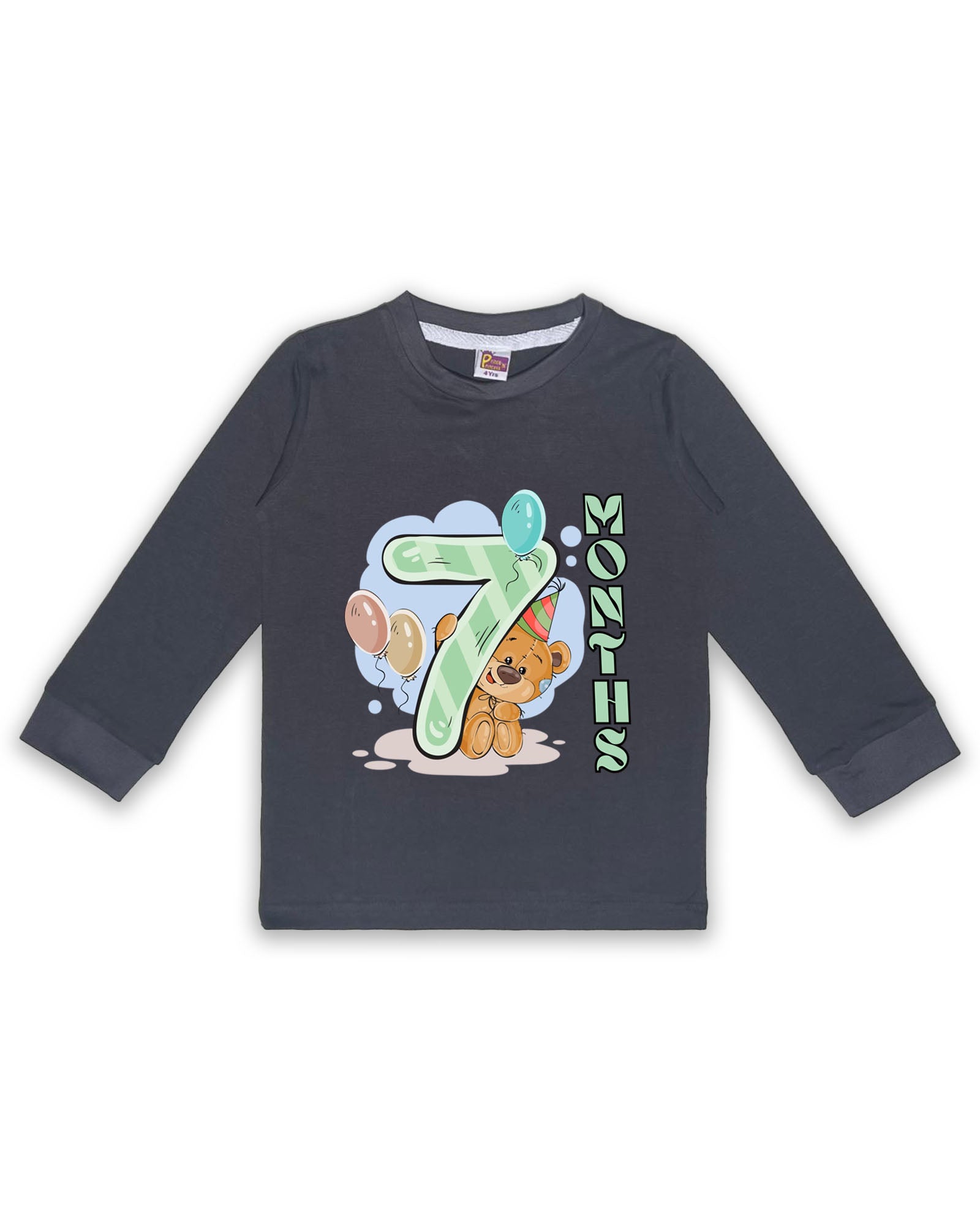Newborn Full-Sleeve Dark Grey Tees - 7 Months Milestone Tees with Party Bear & Balloons Design - Soft Cotton Baby Tees NPT0249