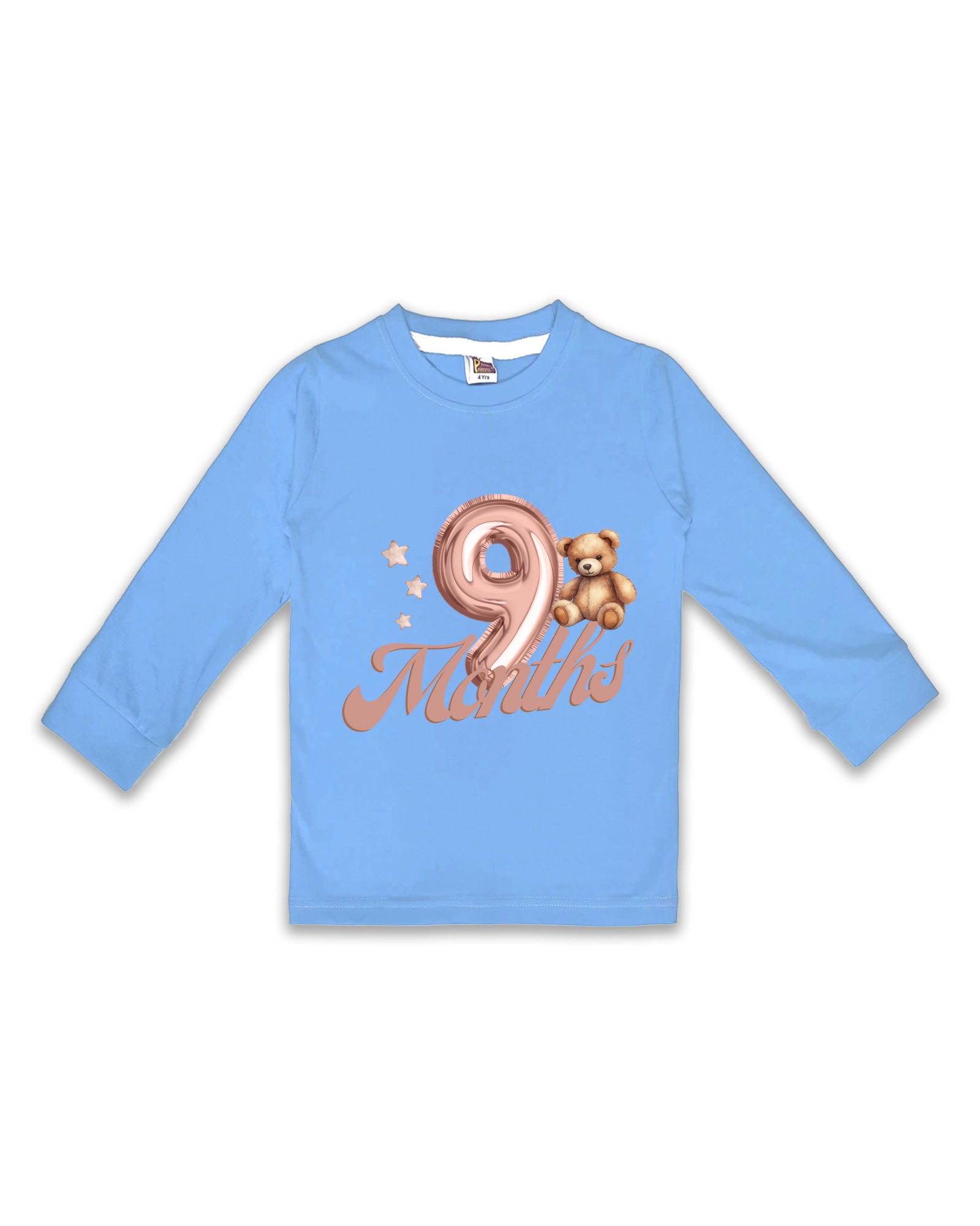 Newborn Full-Sleeve Ice Blue Tees - 9 Months Milestone Tees with Balloon Number & Teddy Bear Design - Soft Cotton Baby Tees NPT0269