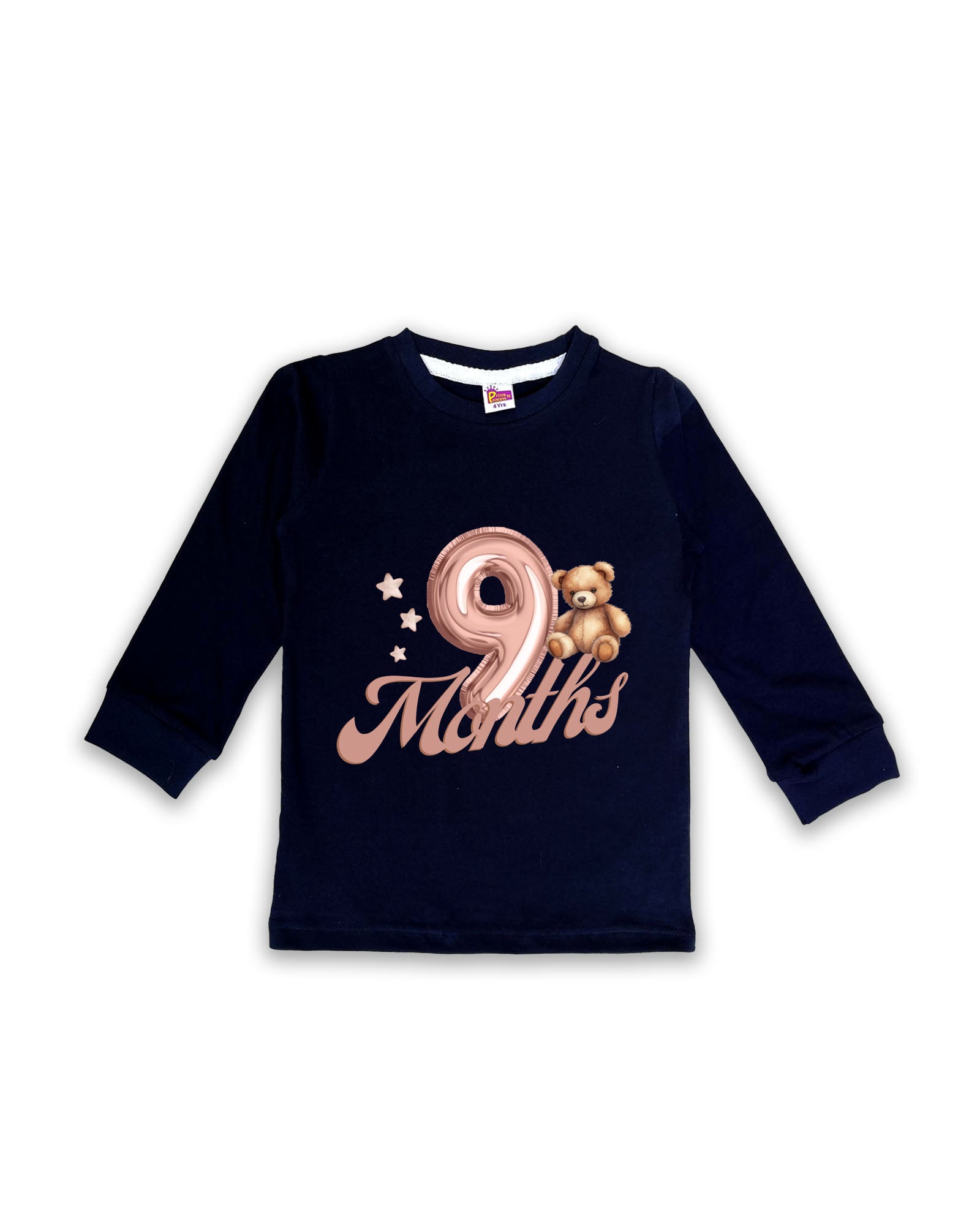 Newborn Full-Sleeve Navy Tees - 9 Months Milestone Tees with Balloon Number & Teddy Bear Design - Soft Cotton Baby Tees NPT0273