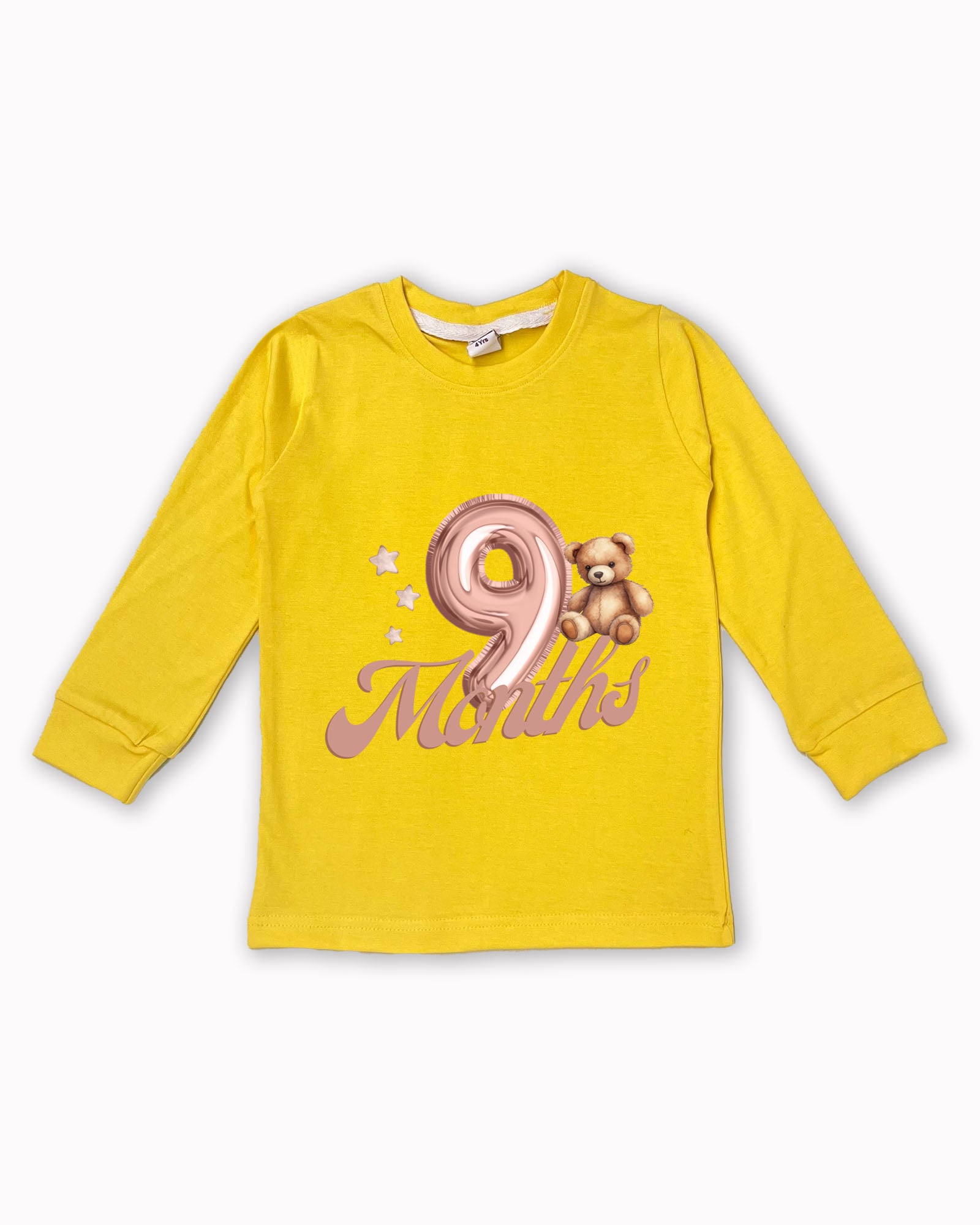 Newborn Full-Sleeve Yellow Tees - 9 Months Milestone Tees with Balloon Number & Teddy Bear Design - Soft Cotton Baby Tees NPT0276