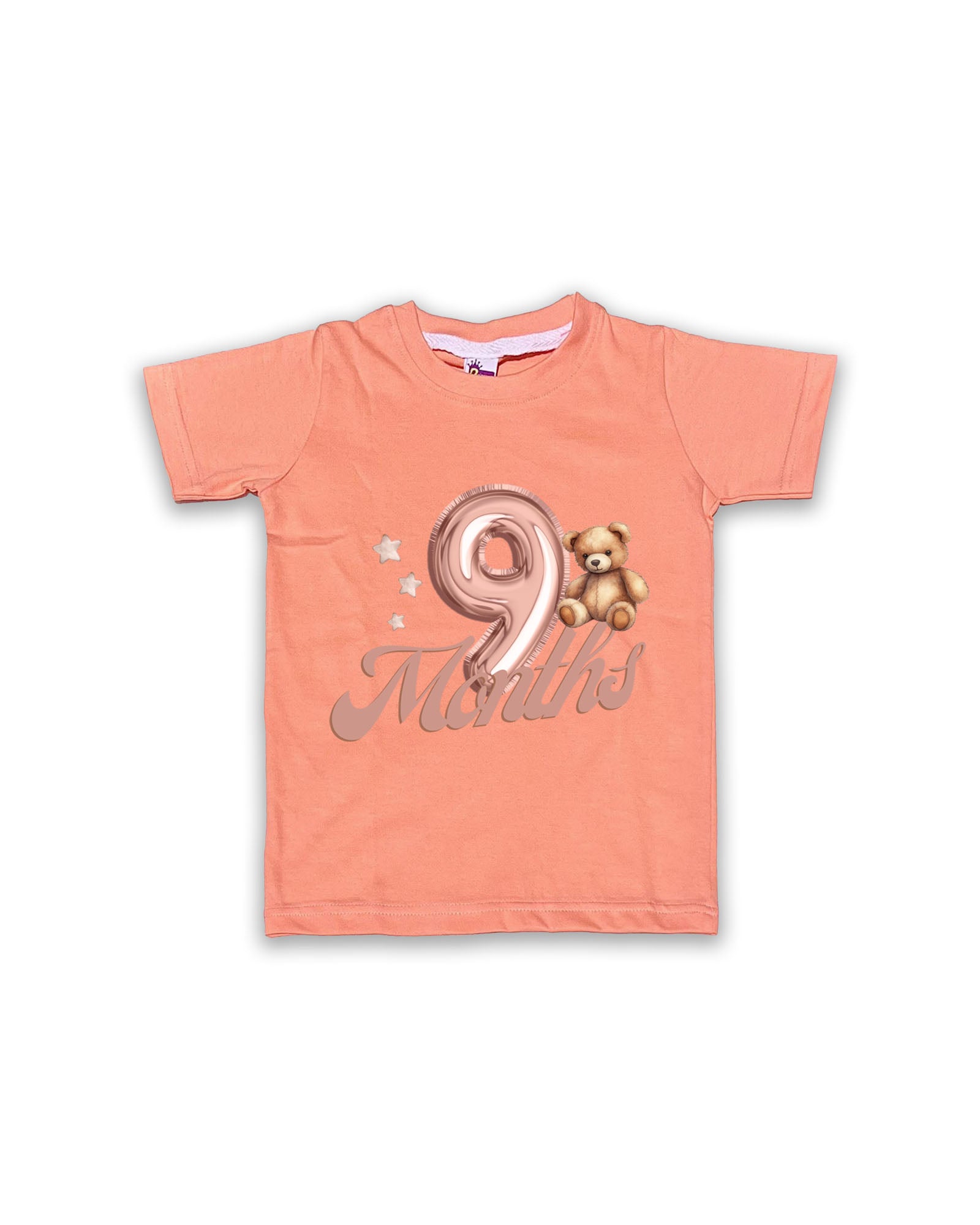 Celebrate your baby’s 9-month milestone with this adorable half-sleeve Peach Tees. Made from soft, breathable cotton, this comfortable vest features a shiny balloon-style number "9" paired with a cute teddy bear and stars. Perfect for milestone photos, everyday wear, or gifting, this tees keeps your baby cozy and stylish. Durable and easy to care for, it’s a wonderful addition to your baby’s wardrobe.