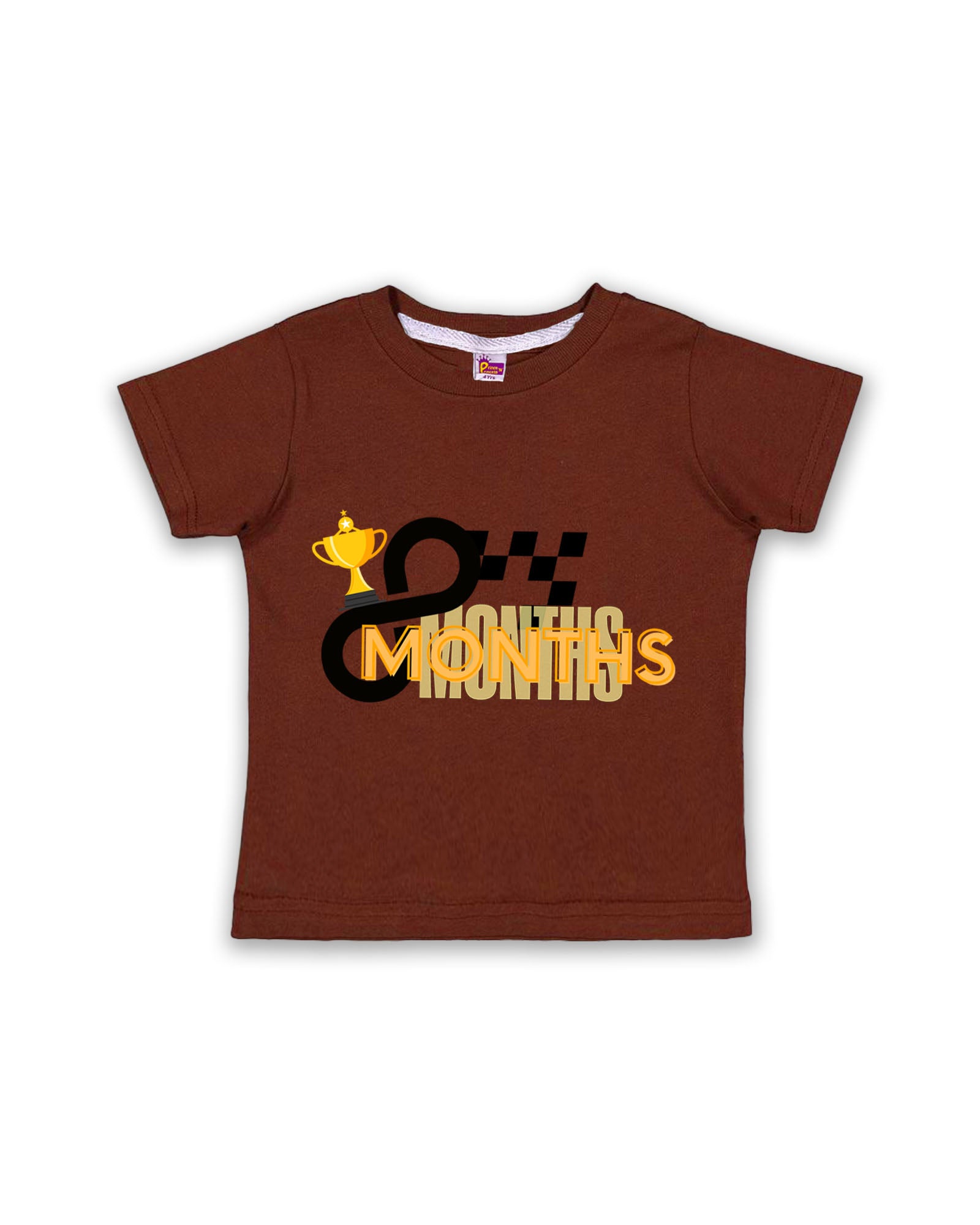 Newborn Half-Sleeve Chocolate Brown Tees - 8 Months Milestone Tees with Racing Trophy & Checkered Flag Design - Soft Cotton Baby Tees NPT0193