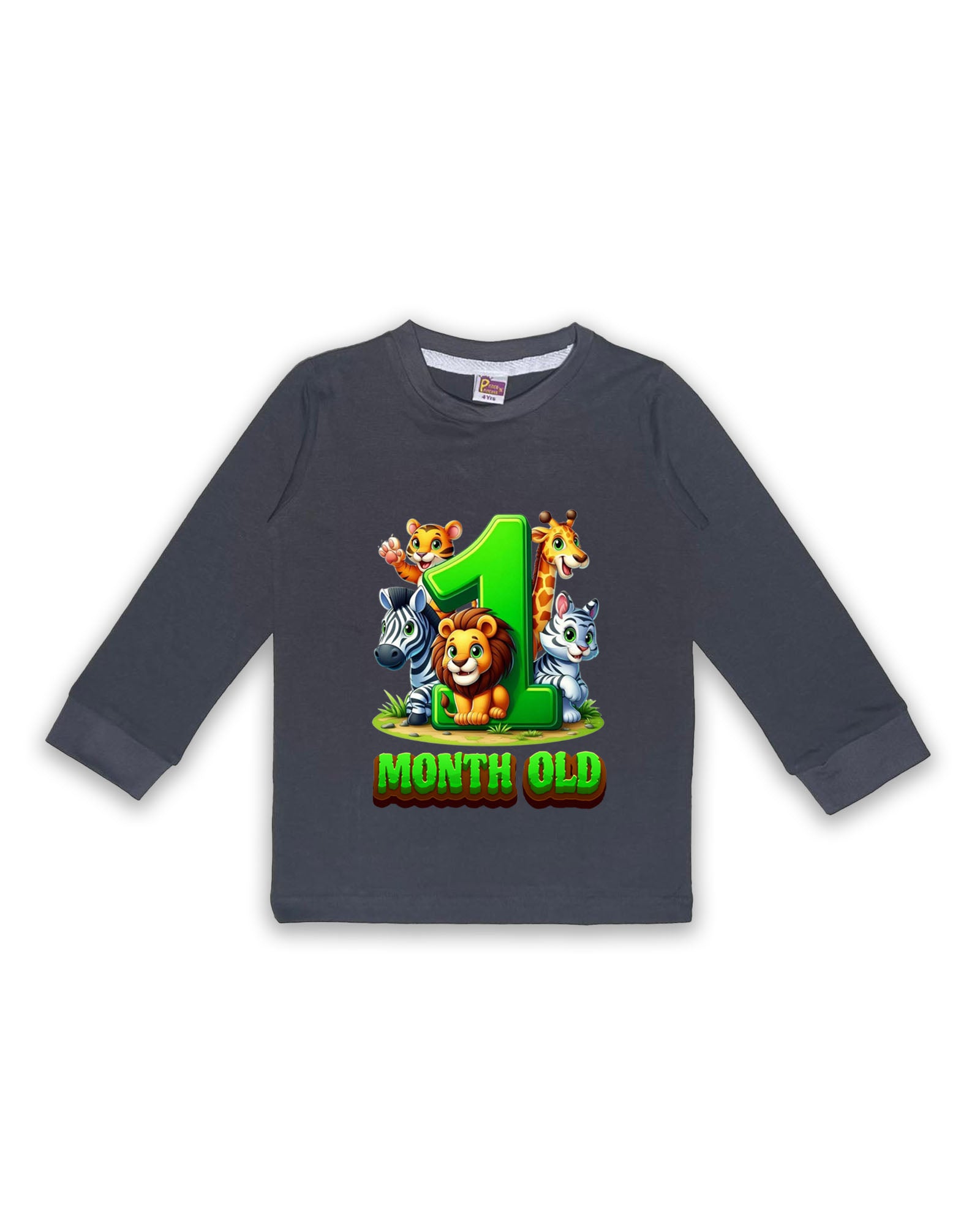 Newborn Dark Grey Full Sleeve "1 Month Old" Birthday Tees – Soft Cotton | Jungle Animal Print | Milestone Outfit NPT007