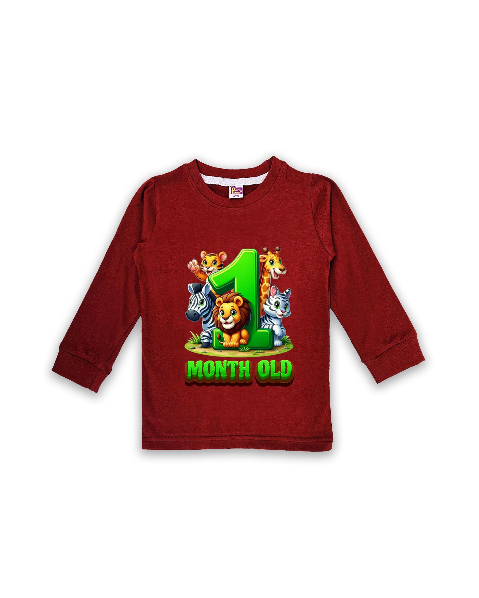 Newborn Maroon Full Sleeve "1 Month Old" Birthday Tees – Soft Cotton | Jungle Animal Print | Milestone Outfit NPT006