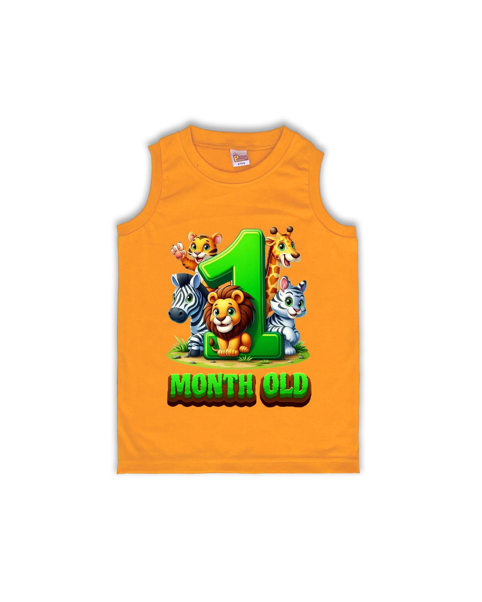 Celebrate your baby’s first big milestone with this adorable Mustard sleeveless Vest featuring “1 Month Old” in a bold green font surrounded by cute jungle animals – lion, zebra, giraffe, and tiger cub. Made from breathable and soft cotton, this vest-style tees is perfect for warm weather and monthly milestone photoshoots.
