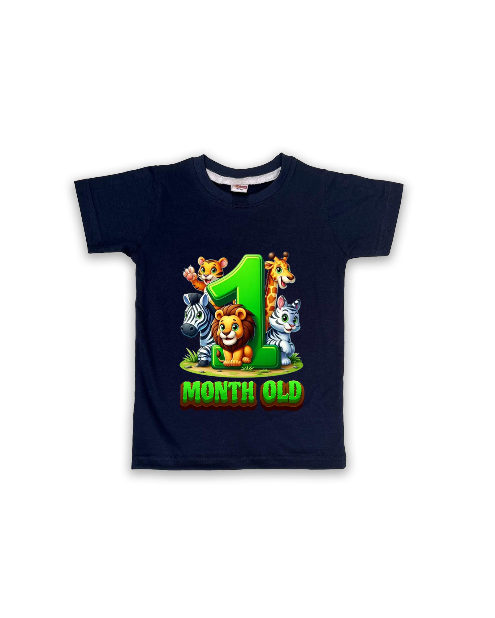 1-Month Milestone Tee: Fun and colorful jungle-themed design with “1 Month Old” print.
