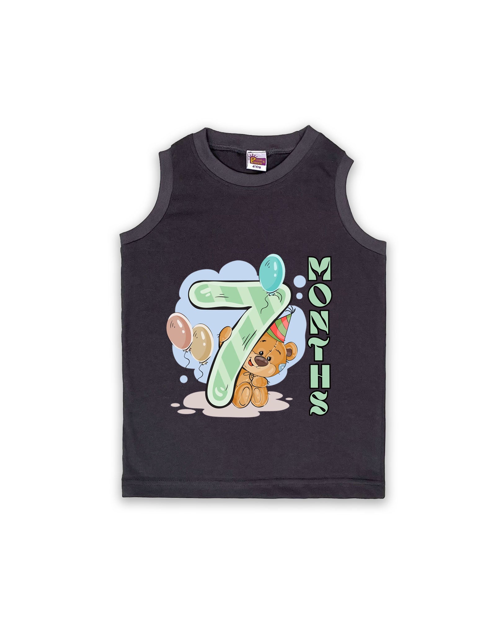 Newborn Sleeveless Dark Grey vest - 7 Months Milestone Vest with Cute Party Bear & Balloons Design - Soft Cotton Baby Vest NPT132