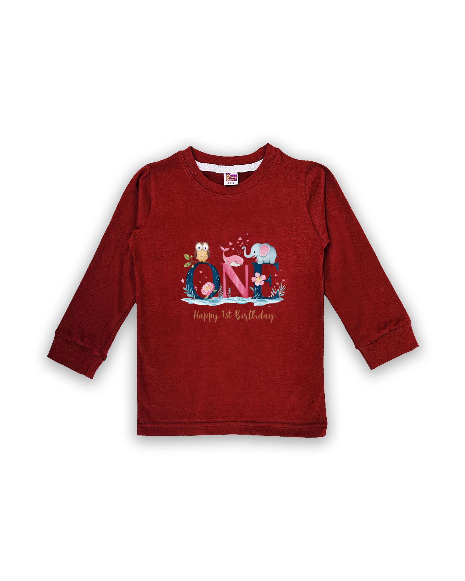 Unisex Full Sleeve Maroon Tees "ONE - Happy 1st Birthday" – Soft Cotton | Cute Animal & Floral Print | First Birthday Outfit| NPT0101